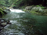でもね、キャスティングが下手でも釣りになりますからご安心を。 まず、川原に立ったらポイントと思われるところを探します。ポイントといっても沢山あるので大まかな所だけ紹介します。落ち込み。流れの合流点。瀬と瀬脇。落ち込みのカタ。トロ場。堰堤。春夏秋によってポイントは変わりますがここを押さえればよいと思います。 |