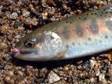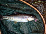 | 野菊の咲く山形の渓流を後にして帰路につきました。まっすぐ家に帰ろうと思ったのですが、時間的にイブニングに間に合うのでM川に寄り道です。先日、渡辺さんが大ヤマメを出したポイントに向かいます。フライはイワナと同じトルドーコーチマン#11です。イブニングにはもってこいの白色カーフテイルのウイング。ヤマメたちがどんな反応を示すのか楽しみです。イワナと同じくトルドーコーチマンはヤマメに有効のようです。ヤマメたちと遊びながらポイントに向かいます。いい感じで暗くなってきました。ポイントでの一投目。「きたー!」サイズのわりには良いファイトでした。渓魚には早い取り込みと速やかなリリースがなによりも大切。これもゆったりとした気持ちで釣りを楽しむことが出来るからなのかもしれないなぁ〜。もっと大きくなれよヤマメ君。 18時納竿。 |