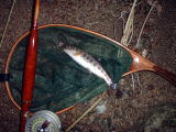 | 今日は絶対に大ヤマメにお目にかかるぞと意気込んで入渓したものの何故かまだボーズ。こうなったら持久戦だ。ドッカリ石に腰を据えて暗くなるのを堰堤の前の川の中で待った。魚は居るのだけれど本当に釣れない日がある。みんなも経験してるだろうね。17時50分小さな虫が飛び始めた。虫を見ていると突然、ヤマメのライズがあってビックリさせられた。だって目の前なんだものね。。。これが合図だった。僕の釣りが始まった。目の前のヤマメを釣り上げてその奥。次にその奥。ヤマメは警戒心をなくしているようだ。ヒットしなかったのは数えきれない。フライが見えるまで振ってみた。約30分の間に面白い釣りができた。終いには大きな虫がドンドン増えて僕にまとわりついて困った。僕って虫には好かれるらしい(^^;ニゲロ〜の状態でした。 ヤマメはこんな時にクレイジーになるんですね。こんなに面白い釣りを知らなきゃダメよ諸君!でも、前回会った奴?彼女?は出てこなかった。もっとイブニングに見えるフライが欲しい。。。何とか釣り上げてほくそえみながら18時30分 納竿。 |