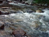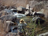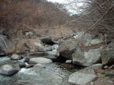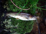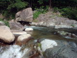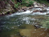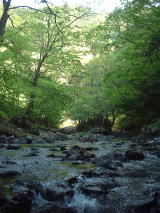 なんといったらいいのか。面白くないことが続くな…Aさんに教えてもらった場所が違ったらしい。Aさんにあって問いただしたらもうちょっと上流だという。釣り師は自分の釣り場を教えないと言うが本当らしい。めげるもんか!と、上流へ向かった。なるほど渓流に下りてみると車からの眺めとは違い大物の気配がした。僕の場合どこでもそう思うんだけどね(^^; しばらく釣りあがってみたが反応なし。やっぱりとの思いがした。渓流の枝を釣ってしまい四苦八苦していると上流に人の気配。あれ?先行者がいたのか。これでは出るわけがありませんね。(^0^)