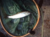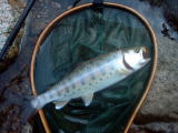 日中はまったくダメだった。日向の緩い流れの底にいるのはウグイ。トリさんがフライを流すとその中でも大きいサイズが浮いてきてくわえた。「やっぱり日中はヤマメ出ないね。」ウグイを外しながらトリさんが言った。二人でのんびりと渓流ウォッチングしながら陽がかげるのを待った。お日様が山に隠れる頃、トリさんが続けてヒットした。「トリさん調子出てきたね。フライは何を使ってるの?」「エルクヘアーカディスの16番。」「うぅ〜僕も持っていないわけじゃないからなぁ〜。」といいつつ手はE.H.Cをティペットに結んでいた。(笑)春先からアダムス一辺倒だったしここら辺で変えてもいいかもしれない。すぐにヤマメがヒット!「本当にヤマメたちの反応はさっきまでとはぜんぜん違うね。」一尾釣れたところでカディスに浮力がなくなって沈むようになった。ヤマメが沈んだカディスを追う。一尾追加。待てよ。。。もしかしたらウェットでいけるんじゃないかな?フライボックスの隅っこにあったコーチマンのウエットフライを結んだ。コーチマンの白いウイングは良く見えた。堰堤まで来たときに陽はだいぶ傾いていて薄暗くなっていた。コーチマンを落ち込みにキャスト。うまい具合に揉まれて沈んだところへロケットが飛んだ。「来た!あられさん、デカッ!」トリさんが叫んだ。ロケットが飛んだところを僕もトリさんもしっかり見ていた。「そんなにでかくないぜ!」でも、ラインが水面に突き刺さっていく。「おっとと、そうはイカの○玉よ!君よりデカイレインボーちゃんで練習済みなのよっと〜」ロケットは右に左にすっ飛ぶ。5Xのティペットがあのスーパーレインボーに耐えられるのは実証済み。足場も良くて取り込みは難しくなかった。「ロケットはロケットでも小型ロケットだね。あはは〜」笑顔で17時50分納竿。