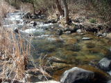街で渓流会のAさんにバッタリ会って携帯電話に保存してある尺ヤマメの写真を見せられた。解禁日に某渓流でゲットしたらしい。クッ〜クヤシー!「ねぇどこ?ここどこ?ねぇ〜。」と、しつこく迫った末にようやく情報を聞き出すことに成功。早速釣行することに。。。この日は気温がグングンと上がり入渓時には20度を越えていました。フリースは車に脱ぎ捨てて軽快に釣りあがります。陽射しが暖かいです。土手にはオオイヌノフグリの青い花が一杯咲いていました。水温も9度と前回よりも随分と上がりました。それにとても流れが澄んでいて綺麗でした。大物の期待大です。クリーム系のパラシュートをパイロットにして釣りあがったのですが上手くヒットしてくれません。じつはこれバーゲンで買ったフックに捲いたフライなのでなんとなく気に入らないんですね、僕もヤマメも。やっぱりこれからは自分のお気に入りのフックを買いましょう。定番アダムス#14がフライボックスにあったのでそれを使います。一投目から乗ってくれました。この感覚ですね。これを覚えちゃったらヤマメ釣りはやめられません。底にはヤマメが好きそうな石がゴロゴロあるし両岸の葦の下のエグレなんか絶好の付き場ですね。ここは以前入ったことがあるのですが、その時は雨上がりで増水していて、太い流れで足をとられ危うく「沈」しそうになったことがあり危ない場所と認識していました。ところがドッコイ!ここはパラダイスだね(^^) しかし、今日はお弁当を持ってきていませんでした。ハラペコには勝てず、尺ヤマメに未練を残しながら13時15分納竿。 青い空には2本の飛行機雲。あぁ〜気持ちいい!