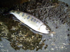 ネットにおさまったヤマメ。よく引くと思ったら胸鰭にスレてました(笑)とりあえずかかったんだからヨシとしましょう。でも、いいすね、このヤマメ。体高のある立派なヤマメです。惚れ惚れします。皆さんも、ライズみっけたらかならず挑戦してみましょう。(^^)