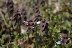ヒメオドリコソウたちとツクシの親子。ほんとうに楽しそう〜。