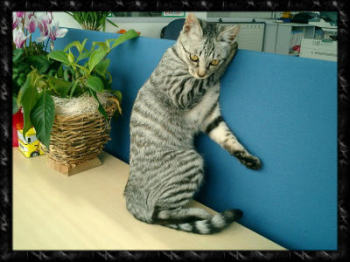 ・・・・・ 会社内を我が物顔で蹂躙している子猫です。 もとは片手に乗るぐらい小さかったのですが・・・。 食欲旺盛でいつの間にか立派になってしまいました。 日中は椅子の上で寝ていますZzz…。 捨て猫だった彼女ですが、今は社内で一番偉いです。