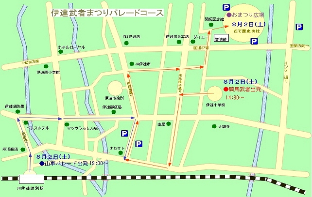 伊達市武者祭りでの山車パレードコースマップ(亘理町あらはま塾 大漁宝ブル・七福神・大漁踊り)