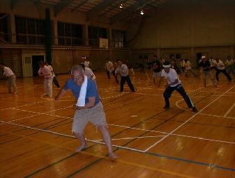 部台を舟として舟引きをしている(荒浜中体育館)![]() |